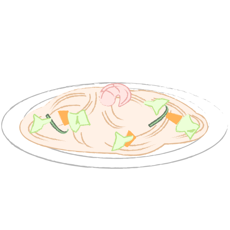 でんぷんをもとに作られるビーフンに、エビ・野菜などを加えて炒めた、焼きビーフンのイラストです。