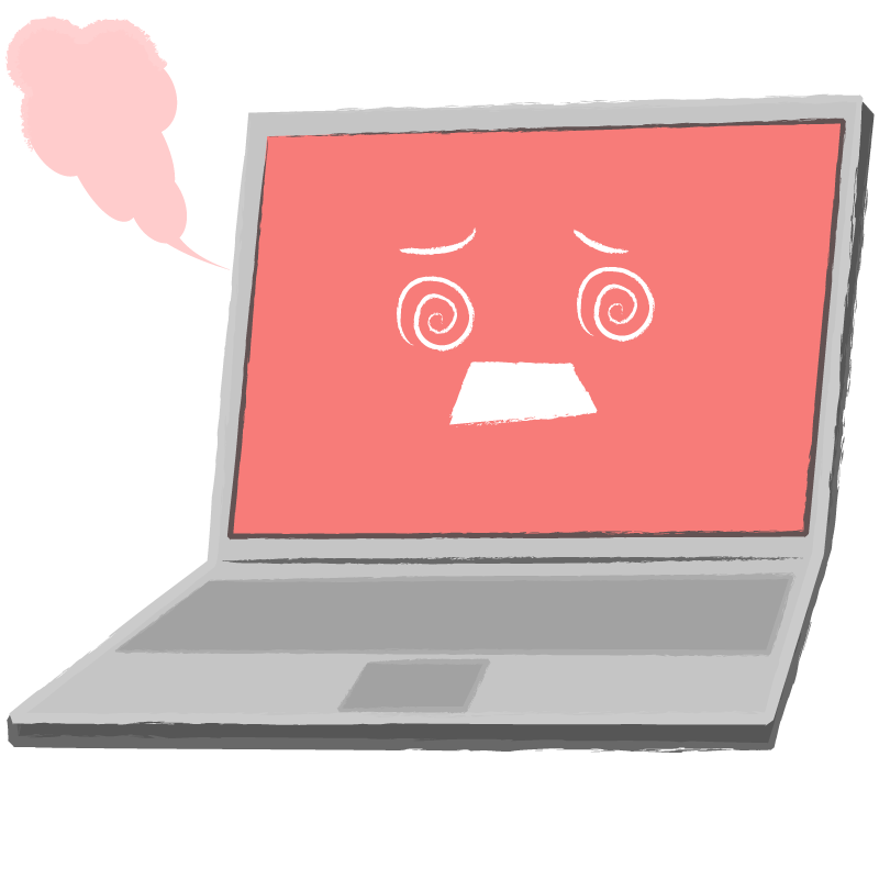 外気や埃、重い処理などの影響で、本体が熱くなってオーバーヒートしているノートパソコンのイラストです。